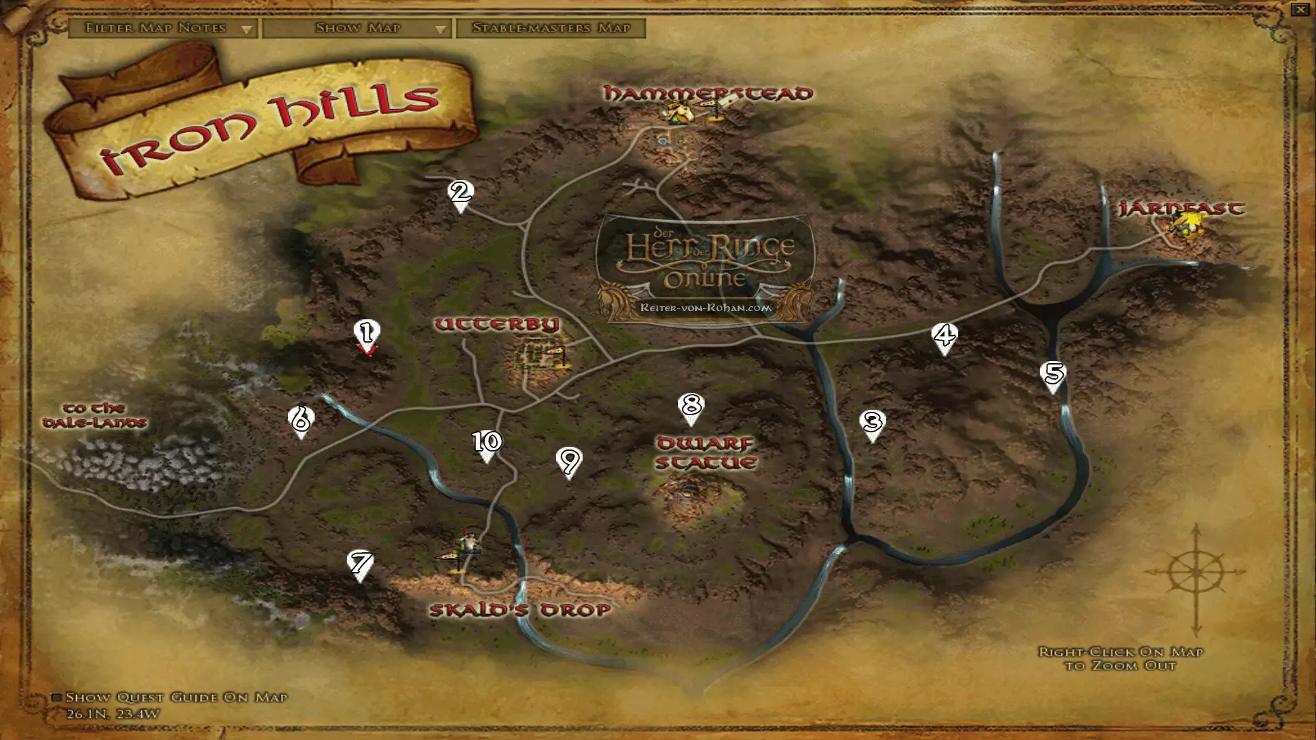 Die Markierungen auf der Karte zeigen den ungefähren Bereich des Fundortes an und müssen daher nicht immer zu 100 % richtig sein! Zudem kann es untrer Umständen sein, dass du dir das Gebiet / Questpack im HdRO Shop kaufen musst, um die Taten zu erhalten / vervollständigen.Damit du die von mir oben genannten Koordinaten leichter zu finden kannst, empfehle ich dir Folgendes Plugin - Way Point
