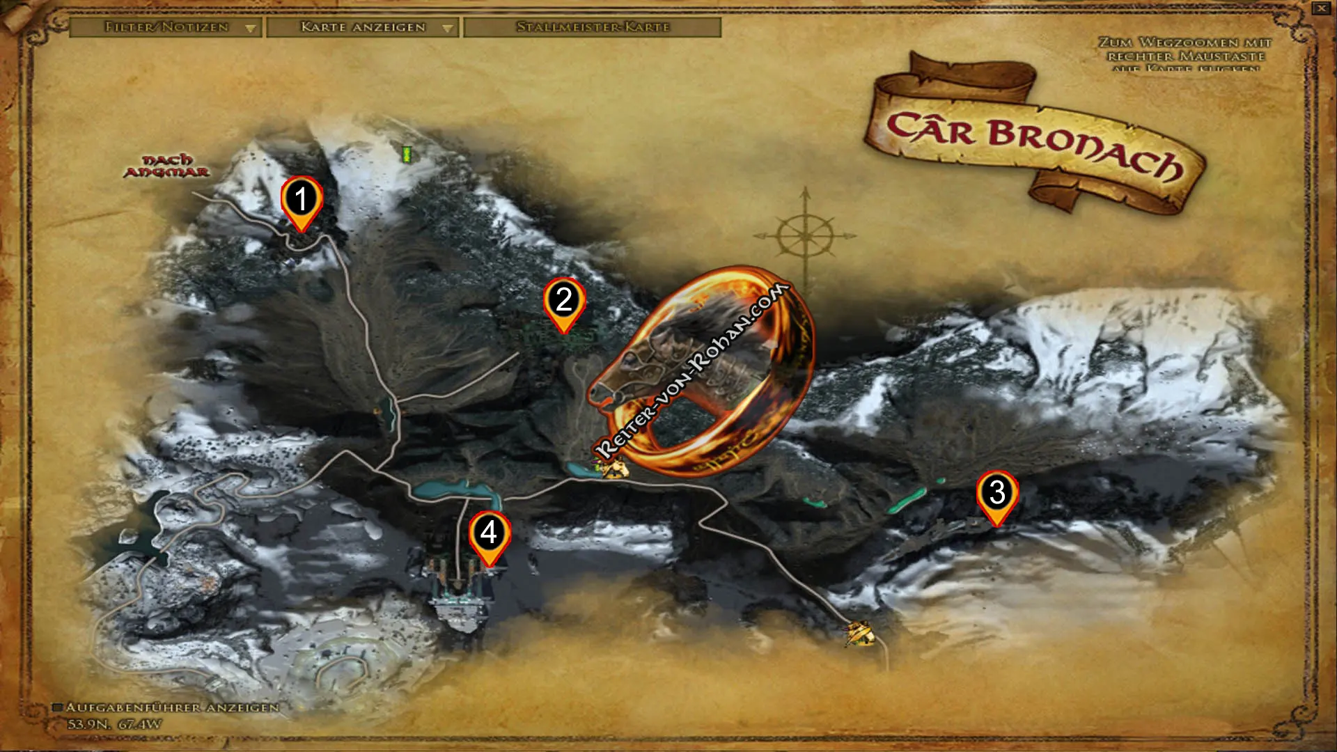 Die Markierungen auf der Karte zeigen den ungefähren Bereich des Fundortes an und müssen daher nicht immer zu 100 % richtig sein! Zudem kann es untrer Umständen sein, dass du dir das Gebiet / Questpack im HdRO Shop kaufen musst, um die Taten zu erhalten / vervollständigen.Damit du die von mir oben genannten Koordinaten leichter zu finden kannst, empfehle ich dir Folgendes Plugin - Way Point