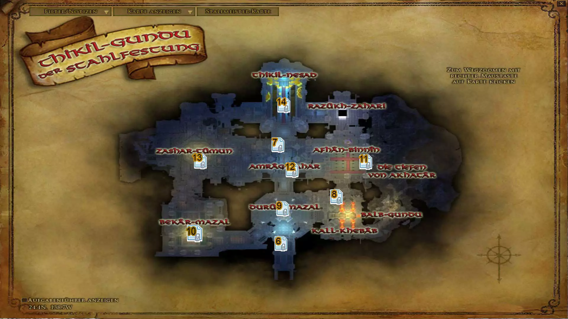 In ganz Ered Mithrin sowie in der Funkenfestung müsst ihr rote, rostige Seiten zum "Verlorenen Wissen der Zwergenfestungen Thikil Gundu" finden. Insgesamt müsst ihr 14 Seiten finden. Einige von denen findet ihr in Ered Mithrin, aber den Großteil der Seiten findet ihr in der Instanz Thikil Gundu, Details dazu unten.