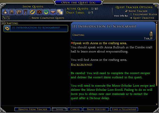 Nachdem ihr euren Berufszweig gewählt habt, bietet euch der Meister oder die Meisterin der Lehrlinge ab sofort drei Aufgaben (eine für jeden Handwerksberuf) an, die wie Einführungen gestaltet sind. Diese Aufgaben haben den Zweck, euch mit grundlegenden Informationen zu versorgen, z. B., wie man Rohstoffe sammelt oder erhält, wie man durch das Handwerksfenster navigiert und wie man Rezepte ausführt, um seinen allerersten selbst gefertigten Gegenstand herzustellen.