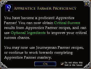 Wir haben viele Instanzen entfernt, bei denen der Handwerksfortschritt durch eine Fortschritts-„Sperre“ gestoppt wurde, die das Abschließen der Aufgabe erforderte. Bei Abschluss einer Geschicklichkeit für jedwede Handwerksstufe erscheinen ab sofort auf den Beruf abgestimmte Hinweise voller nützlicher Informationen. Das führt zu einem reibungslosen Handwerksfortschritt durch alle Stufen jedes Berufs.