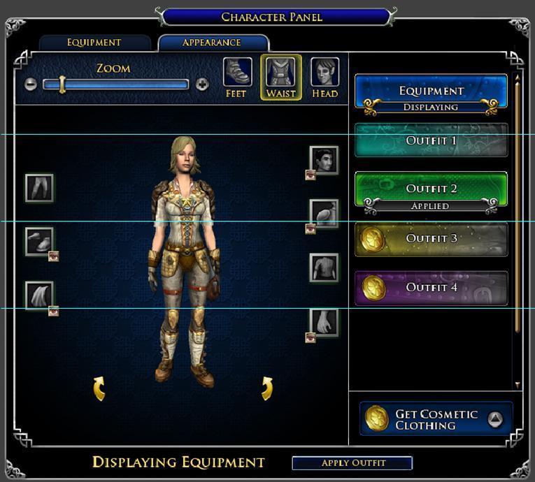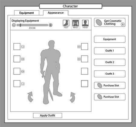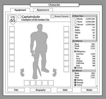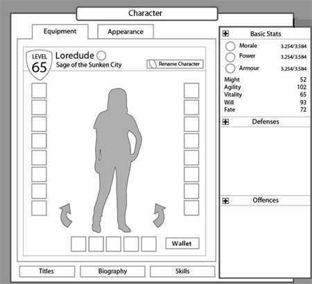 Während der Free-to-Play-Entwicklung lautete eine der vielen fortlaufenden Initiativen "Benutzerfreundlichkeit". Darunter fielen alle Sachen wie die Neugestaltung des Einsteigerspiels, die Charaktergenerierung und eben auch das Charakterfenster. Amlug und ich arbeiteten am ersten Konzept zusammen und definierten mehrere zentrale Ziele: