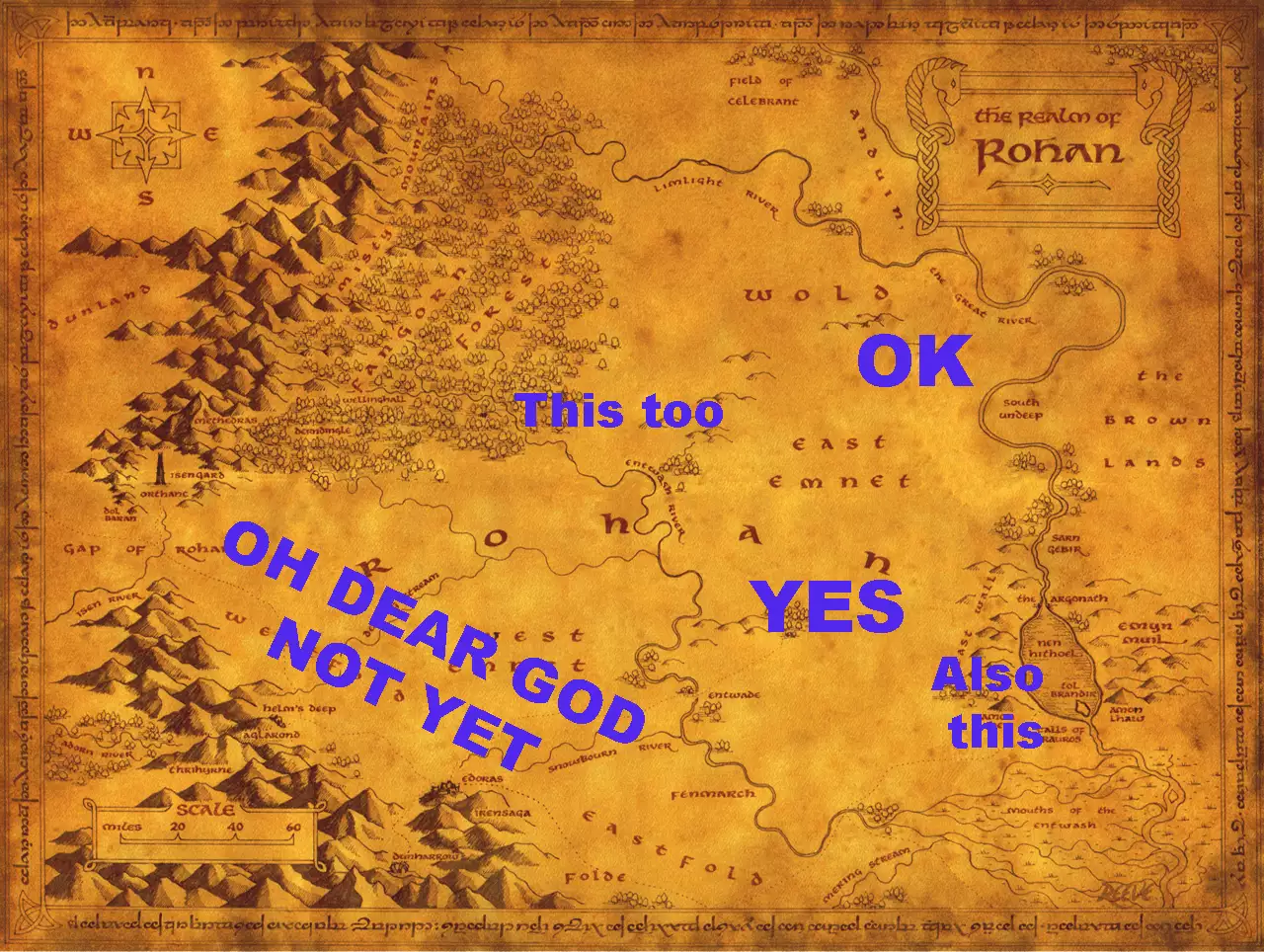 Meine erste Aufgabe war, eine Karte des Königreiches in die Hand zu nehmen, und den Mächtigen zu zeigen, dass es keine denkbare Möglichkeit gab, ganz Rohan in einem Durchgang zu gestalten. Es ist einfach zu groß, um der Sache gerecht zu werden. Die naheliegendste Lösung des Problems war, es einfach zu halbieren, entlang der offensichtlichsten geographischen Grenze, dem Entwasser-Fluss, der Ost-Emnet von West-Emnet trennt. Wir würden zuerst mit dem östlichen Teil beginnen, denn er schließt sich an die Region des Großen Flusses an, und es ist dort, wo die Ringemeinschaft zuerst mit Rohan in Berührung kommt.