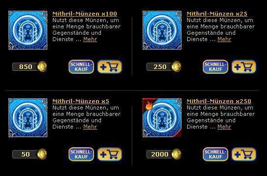 Die Mithrill-Münzen könnt ihr im Ingame Shop Erwerben, es gibt dort verschiedene Pakete zu verschiedenen Preisen. Das Günstigste wären hier für 50 Shop Punkte 5 Mithrill Münzen